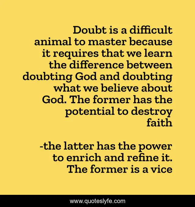 This page presents the quote "Doubt is a difficult animal to master because it requires that we learn the difference between doubting God and doubting what we believe about God. The former has the potential to destroy faith". Author of this quote is the latter has the power to enrich and refine it. The former is a vice. .