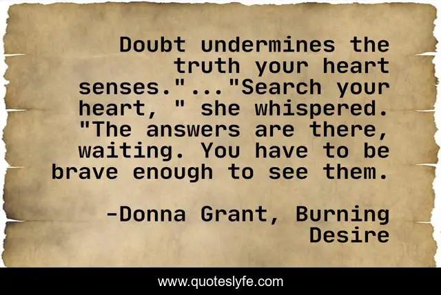 This page presents the quote "Doubt undermines the truth your heart senses."..."Search your heart, " she whispered. "The answers are there, waiting. You have to be brave enough to see them.". Author of this quote is Donna Grant, Burning Desire. This quote is about paranormal-romance, dragons,.