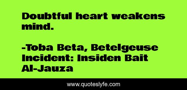 This page presents the quote "Doubtful heart weakens mind.". Author of this quote is Toba Beta, Betelgeuse Incident: Insiden Bait Al-Jauza. This quote is about heart, doubt, mind, weak,.