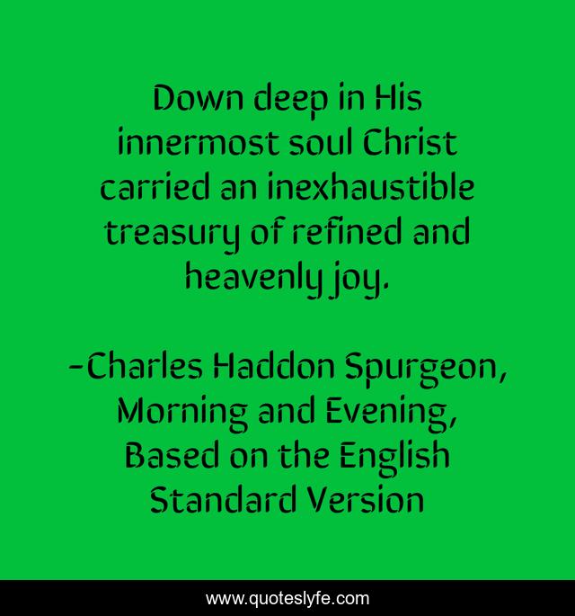 This page presents the quote "Down deep in His innermost soul Christ carried an inexhaustible treasury of refined and heavenly joy.". Author of this quote is Charles Haddon Spurgeon, Morning and Evening, Based on the English Standard Version. This quote is about discipleship, intimacy-with-god, resilience,.