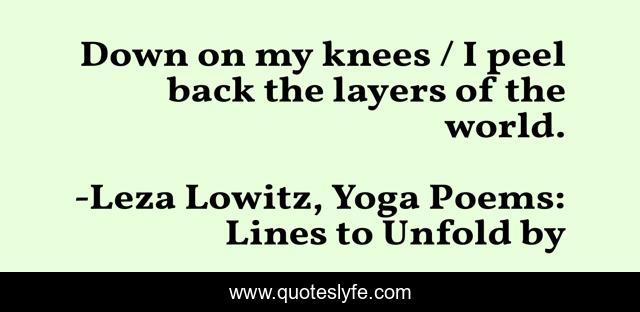 This page presents the quote "Down on my knees / I peel back the layers of the world.". Author of this quote is Leza Lowitz, Yoga Poems: Lines to Unfold by. This quote is about meditation, yoga, poetry,.