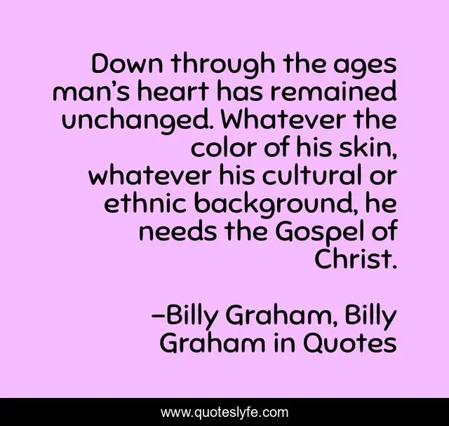 This page presents the quote "Down through the ages man’s heart has remained unchanged. Whatever the color of his skin, whatever his cultural or ethnic background, he needs the Gospel of Christ.". Author of this quote is Billy Graham, Billy Graham in Quotes. This quote is about race, billy-graham,.