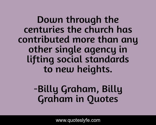 This page presents the quote "Down through the centuries the church has contributed more than any other single agency in lifting social standards to new heights.". Author of this quote is Billy Graham, Billy Graham in Quotes. This quote is about social-standards, billy-graham, church,.
