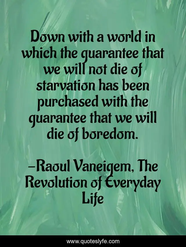 This page presents the quote "Down with a world in which the guarantee that we will not die of starvation has been purchased with the guarantee that we will die of boredom.". Author of this quote is Raoul Vaneigem, The Revolution of Everyday Life. This quote is about life, work,.