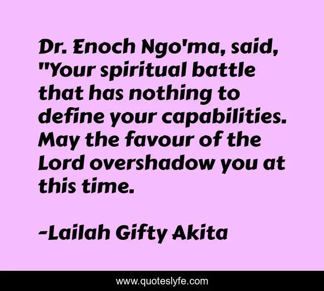 This page presents the quote "Dr. Enoch Ngo'ma, said, "Your spiritual battle that has nothing to define your capabilities. May the favour of the Lord overshadow you at this time.". Author of this quote is Lailah Gifty Akita. This quote is about spiritual-growth, spiritual-wisdom, capable, grace-divine, struggle-of-existence, struggles, struggle-of-existence-graduate, favour, capability,.