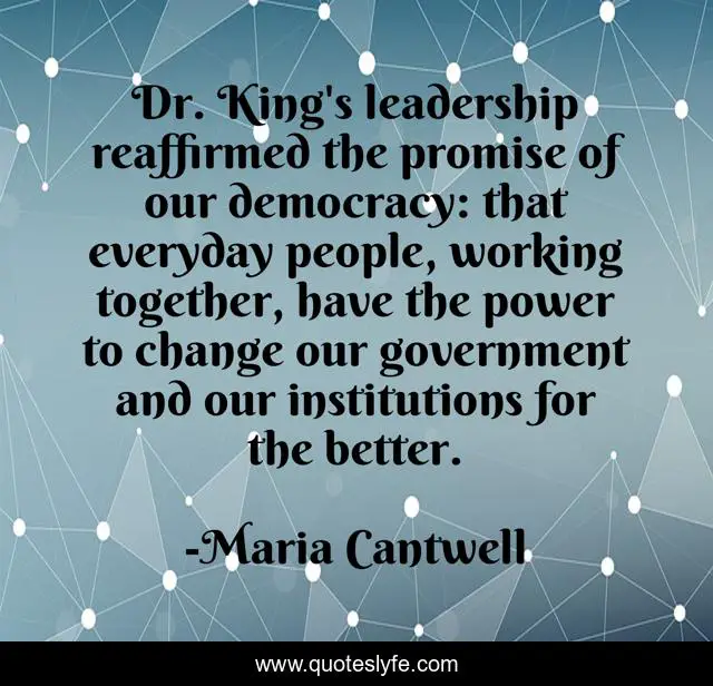 This page presents the quote "Dr. King's leadership reaffirmed the promise of our democracy: that everyday people, working together, have the power to change our government and our institutions for the better.". Author of this quote is Maria Cantwell. This quote is about leadership, change,.