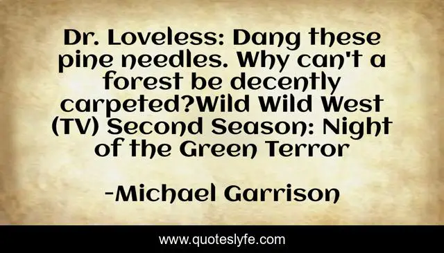 This page presents the quote "Dr. Loveless: Dang these pine needles. Why can't a forest be decently carpeted?Wild Wild West (TV) Second Season: Night of the Green Terror". Author of this quote is Michael Garrison. .