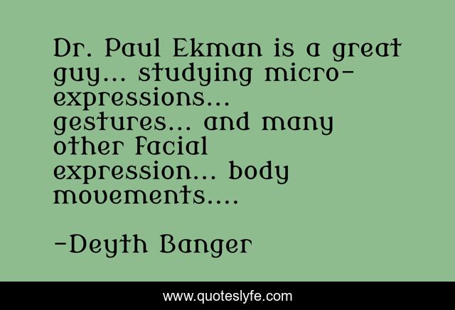 This page presents the quote "Dr. Paul Ekman is a great guy... studying micro-expressions... gestures... and many other facial expression... body movements....". Author of this quote is Deyth Banger. This quote is about body, studying, great, guy, movements,.