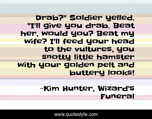 This page presents the quote "Drab?" Soldier yelled. "I'll give you drab. Beat her, would you? Beat my wife? I'll feed your head to the vultures, you snotty little hamster with your golden pelt and buttery looks!". Author of this quote is Kim Hunter, Wizard's Funeral. This quote is about funny, comedy, soldier, kim-hunter, wizard-s-funeral,.