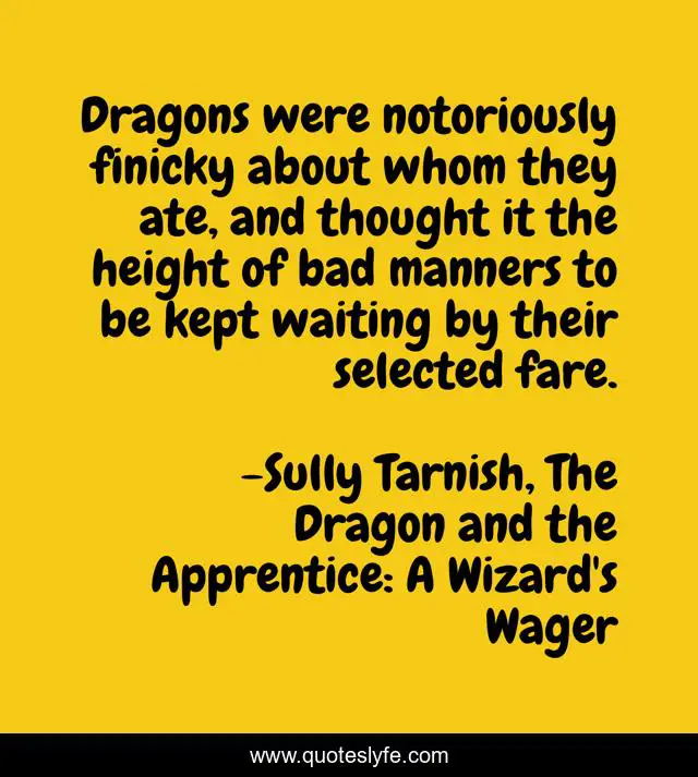 This page presents the quote "Dragons were notoriously finicky about whom they ate, and thought it the height of bad manners to be kept waiting by their selected fare.". Author of this quote is Sully Tarnish, The Dragon and the Apprentice: A Wizard's Wager. This quote is about magic, dragon, fantasy, sword-and-sorcery, dragons, young-adult,.
