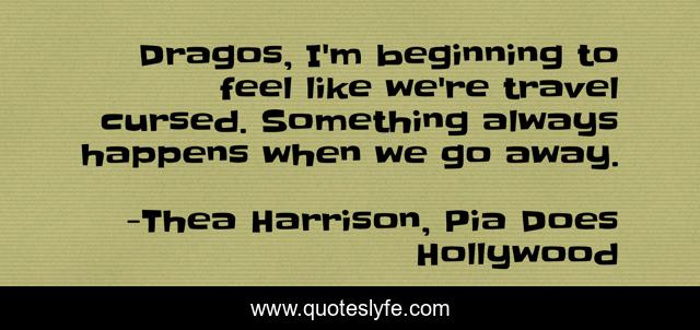 This page presents the quote "Dragos, I'm beginning to feel like we're travel cursed. Something always happens when we go away.". Author of this quote is Thea Harrison, Pia Does Hollywood. This quote is about dragons, elder-races, zombies, fae,.
