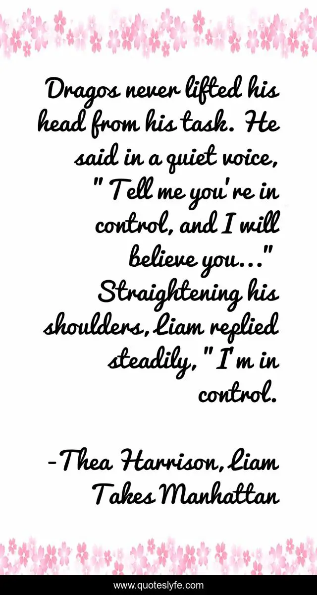 This page presents the quote "Dragos never lifted his head from his task. He said in a quiet voice, "Tell me you're in control, and I will believe you..." Straightening his shoulders, Liam replied steadily, "I'm in control.". Author of this quote is Thea Harrison, Liam Takes Manhattan. This quote is about paranormal, elder-races, teenage-rebellion,.