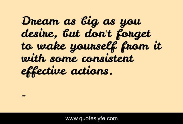 This page presents the quote "Dream as big as you desire, but don't forget to wake yourself from it with some consistent effective actions.". Author of this quote is . This quote is about consistent-effective-actions, edmond-mbiaka, consistent-action, dream-as-big-as-you-desire, dreams, dreaming-big, effective-actions, dream, taking-action,.