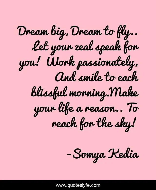 This page presents the quote "Dream big, Dream to fly.. Let your zeal speak for you! Work passionately, And smile to each blissful morning.Make your life a reason.. To reach for the sky!". Author of this quote is Somya Kedia. This quote is about fly, life, zeal, big, work, sky, morning, reason, passion,.