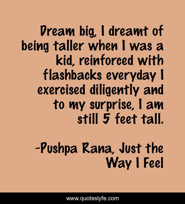 This page presents the quote "Dream big, I dreamt of being taller when I was a kid, reinforced with flashbacks everyday I exercised diligently and to my surprise, I am still 5 feet tall.". Author of this quote is Pushpa Rana, Just the Way I Feel. This quote is about dreamt, excercise, 5-feet, goal, surprise,.