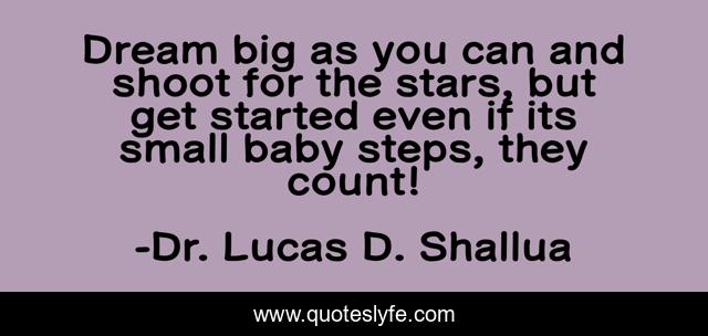This page presents the quote "Dream big as you can and shoot for the stars, but get started even if its small baby steps, they count!". Author of this quote is Dr. Lucas D. Shallua. This quote is about inspirational-attitude, procrastination, success, art-of-starting,.