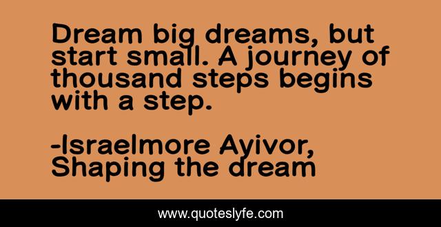 This page presents the quote "Dream big dreams, but start small. A journey of thousand steps begins with a step.". Author of this quote is Israelmore Ayivor, Shaping the dream. This quote is about smaller, bit-by-bit, dream-big, food-for-thought, tiny, start, israelmore-ayivor, begin, big,.