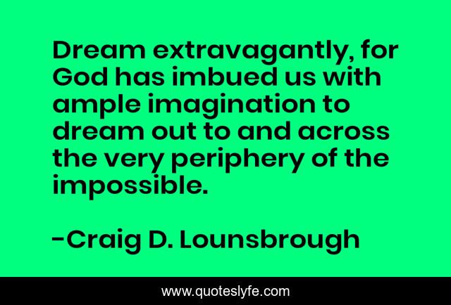 This page presents the quote "Dream extravagantly, for God has imbued us with ample imagination to dream out to and across the very periphery of the impossible.". Author of this quote is Craig D. Lounsbrough. This quote is about god, dreaming, challenges, imagination, imagine, impossible, dreams,.