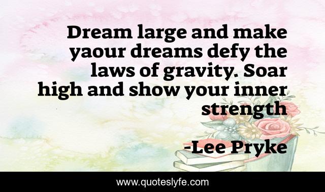This page presents the quote "Dream large and make yaour dreams defy the laws of gravity. Soar high and show your inner strength". Author of this quote is Lee Pryke. This quote is about dream, strength, dream-large, soar,.