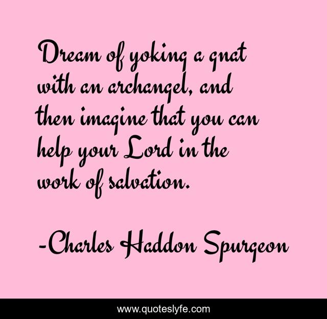 This page presents the quote "Dream of yoking a gnat with an archangel, and then imagine that you can help your Lord in the work of salvation.". Author of this quote is Charles Haddon Spurgeon. This quote is about eternity, calvinism, holiness, god, christianity, the-bible, wisdom, salvation, grace,.