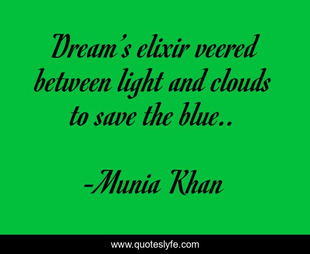 This page presents the quote "Dream’s elixir veered between light and clouds to save the blue..". Author of this quote is Munia Khan. This quote is about blue, clouds, sky, wisdom, lights, dreams, elixir, saving, save,.