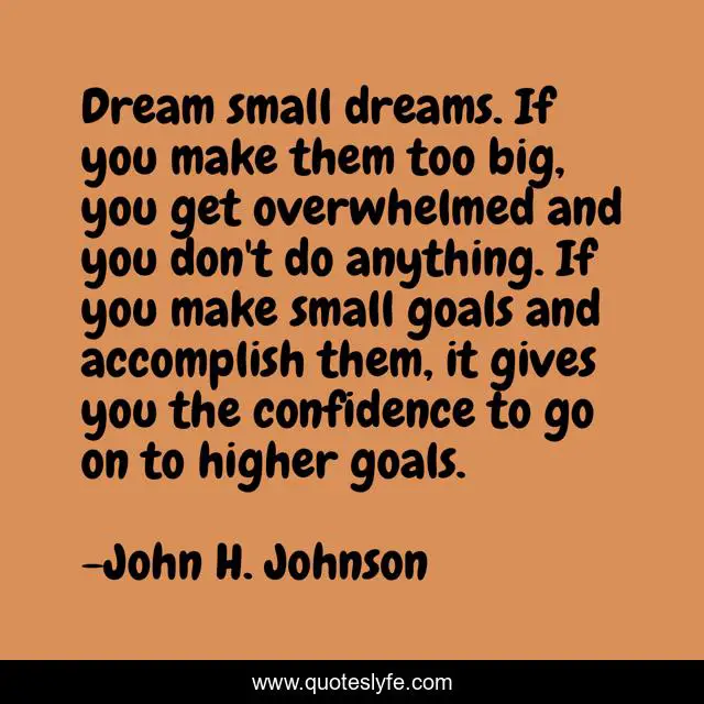 This page presents the quote "Dream small dreams. If you make them too big, you get overwhelmed and you don't do anything. If you make small goals and accomplish them, it gives you the confidence to go on to higher goals.". Author of this quote is John H. Johnson. This quote is about positive, confidence, goals,.