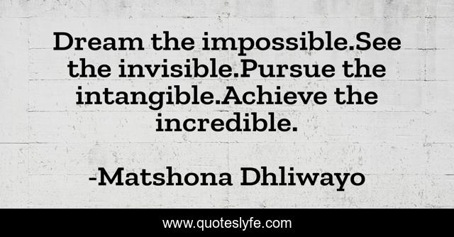 "Matshona Dhliwayo Quotes." Quoteslyfe.com, 2025. Mon. 08 Dec. 2025. <https://www.quoteslyfe.com/quote/Dream-the-impossible-See-the-invisible-Pursue-109129>.