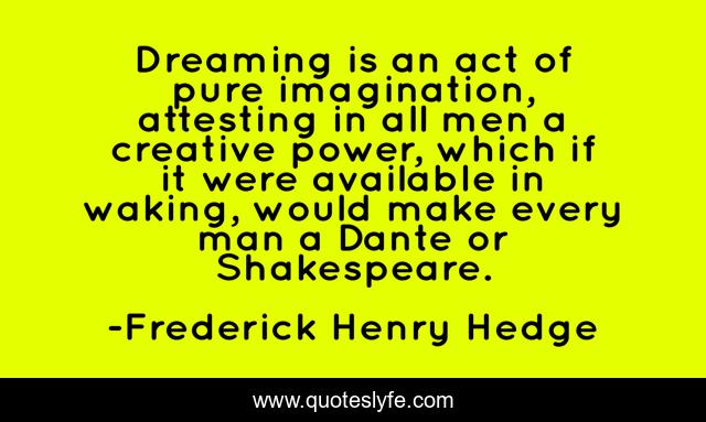 This page presents the quote "Dreaming is an act of pure imagination, attesting in all men a creative power, which if it were available in waking, would make every man a Dante or Shakespeare.". Author of this quote is Frederick Henry Hedge. This quote is about men, power, man,.