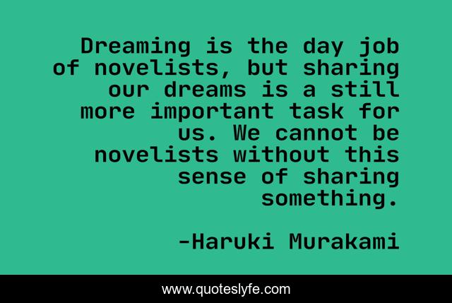 This page presents the quote "Dreaming is the day job of novelists, but sharing our dreams is a still more important task for us. We cannot be novelists without this sense of sharing something.". Author of this quote is Haruki Murakami. This quote is about enthusiasm, inspirational, writing,.
