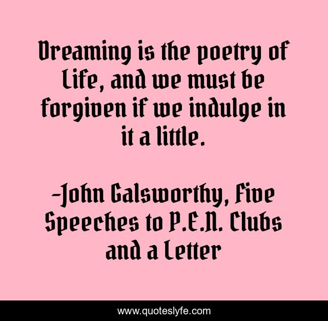This page presents the quote "Dreaming is the poetry of Life, and we must be forgiven if we indulge in it a little.". Author of this quote is John Galsworthy, Five Speeches to P.E.N. Clubs and a Letter. This quote is about american-pen-center, nobel-laureate, human-nature, poetry-of-life, john-galsworthy, inspirational, enthusiasm, pen-clubs, dreams,.