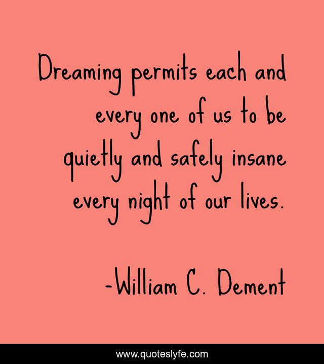 This page presents the quote "Dreaming permits each and every one of us to be quietly and safely insane every night of our lives.". Author of this quote is William C. Dement. This quote is about dreams, insanity,.