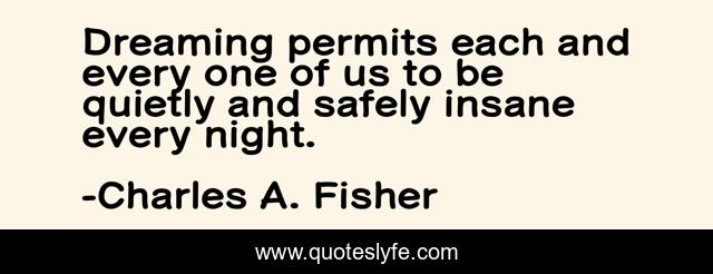 This page presents the quote "Dreaming permits each and every one of us to be quietly and safely insane every night.". Author of this quote is Charles A. Fisher. This quote is about sleep, dreams, insanity,.