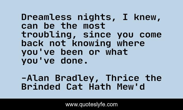 "Alan Bradley, Thrice the Brinded Cat Hath Mew'd Quotes." Quoteslyfe.com, 2025. Fri. 05 Dec. 2025. <https://www.quoteslyfe.com/quote/Dreamless-nights-I-knew-can-be-the-53776>.