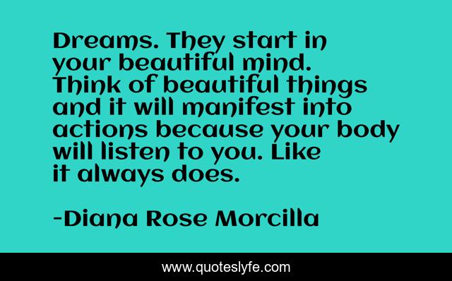 This page presents the quote "Dreams. They start in your beautiful mind. Think of beautiful things and it will manifest into actions because your body will listen to you. Like it always does.". Author of this quote is Diana Rose Morcilla. This quote is about art, inspire, blogger, quotes, happiness, poetry, writing, enthusiasm, hope,.