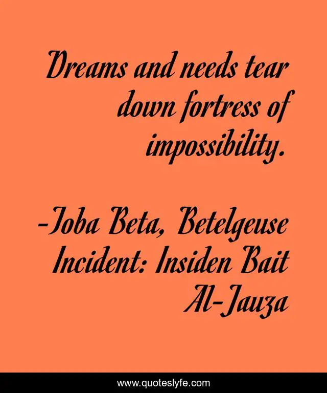 This page presents the quote "Dreams and needs tear down fortress of impossibility.". Author of this quote is Toba Beta, Betelgeuse Incident: Insiden Bait Al-Jauza. This quote is about need, dream, fortress-of-impossibility,.