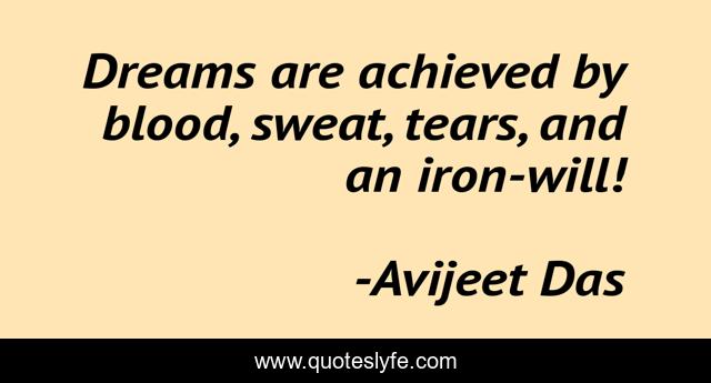 This page presents the quote "Dreams are achieved by blood, sweat, tears, and an iron-will!". Author of this quote is Avijeet Das. This quote is about confidence, positive, blood, motivational, iron-will, optimistic, inspirational, never-quit, enthusiasm,.