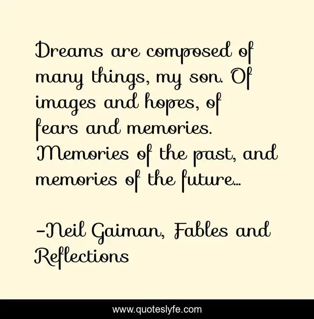 This page presents the quote "Dreams are composed of many things, my son. Of images and hopes, of fears and memories. Memories of the past, and memories of the future...". Author of this quote is Neil Gaiman, Fables and Reflections. This quote is about memories, dreams,.