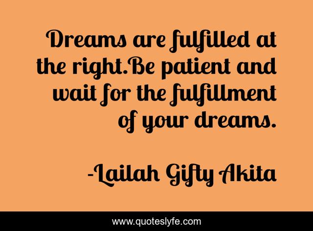 This page presents the quote "Dreams are fulfilled at the right.Be patient and wait for the fulfillment of your dreams.". Author of this quote is Lailah Gifty Akita. This quote is about dreamer-of-the-stars, dream-big, dream, dreamers-versus-reasoners, dreams-come-true, dreaming, dreamer, dreams-inspirational, dreams,.