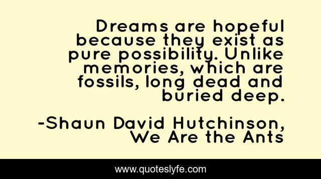 This page presents the quote "Dreams are hopeful because they exist as pure possibility. Unlike memories, which are fossils, long dead and buried deep.". Author of this quote is Shaun David Hutchinson, We Are the Ants. This quote is about memories, life, we-are-the-ants, dreams,.