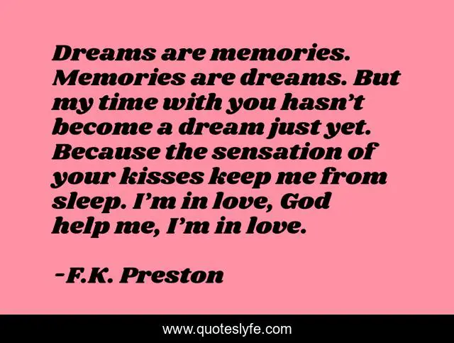 This page presents the quote "Dreams are memories. Memories are dreams. But my time with you hasn’t become a dream just yet. Because the sensation of your kisses keep me from sleep. I’m in love, God help me, I’m in love.". Author of this quote is F.K. Preston. This quote is about magical-realism, love, romantic, surreal, memories, dreaming, kisses, romance, surrealism,.
