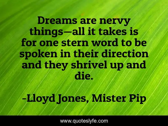 This page presents the quote "Dreams are nervy things—all it takes is for one stern word to be spoken in their direction and they shrivel up and die.". Author of this quote is Lloyd Jones, Mister Pip. .