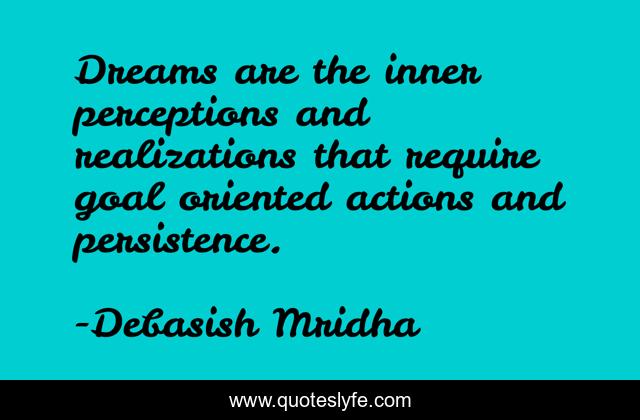 This page presents the quote "Dreams are the inner perceptions and realizations that require goal oriented actions and persistence.". Author of this quote is Debasish Mridha. This quote is about inner-perceptions, philosophy, debasish-mridha, goal-oriented, quotes, dreams, inspirational, enthusiasm, debasish-mridha-m-d,.