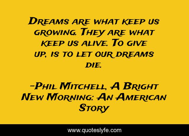 This page presents the quote "Dreams are what keep us growing. They are what keep us alive. To give up, is to let our dreams die.". Author of this quote is Phil Mitchell, A Bright New Morning: An American Story. This quote is about enthusiasm, dreams, inspirational,.
