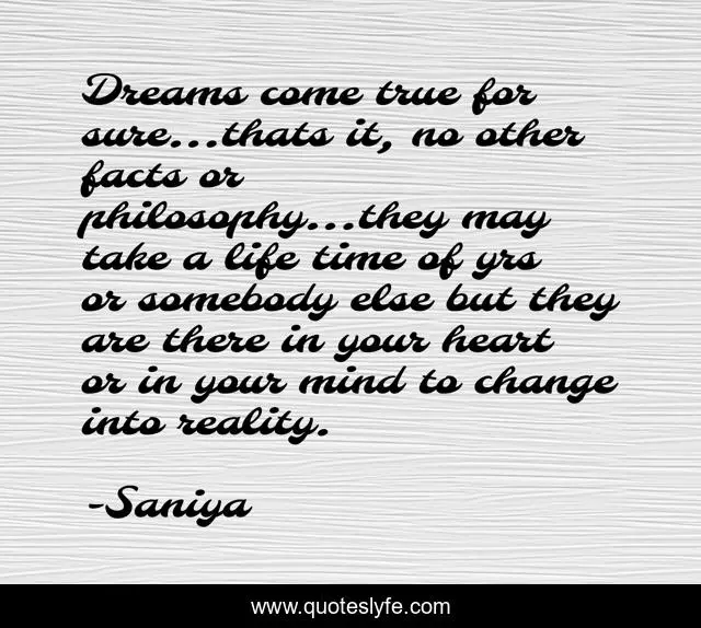 This page presents the quote "Dreams come true for sure...thats it, no other facts or philosophy...they may take a life time of yrs or somebody else but they are there in your heart or in your mind to change into reality.". Author of this quote is Saniya. This quote is about heart, mind, reality, change, facts, dreams,.