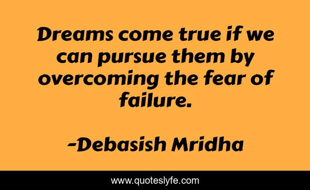 This page presents the quote "Dreams come true if we can pursue them by overcoming the fear of failure.". Author of this quote is Debasish Mridha. This quote is about philosophy, debasish-mridha, overcome-the-fear-of-failure, debasish-mridha-m-d, quotes, dreams-come-true, inspirational, enthusiasm, pursue-your-dreams,.