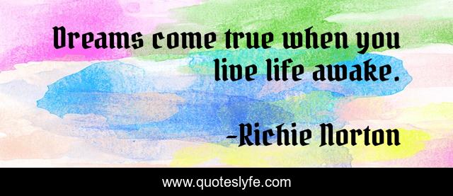 This page presents the quote "Dreams come true when you live life awake.". Author of this quote is Richie Norton. This quote is about confidence, self-mastery, mindful, marketing, work, success, self-help, entrepreneur, innovation,.