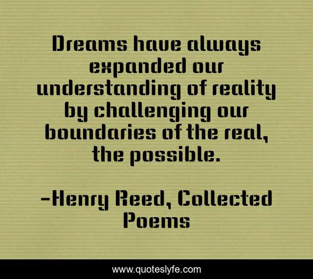 This page presents the quote "Dreams have always expanded our understanding of reality by challenging our boundaries of the real, the possible.". Author of this quote is Henry Reed, Collected Poems. This quote is about possible, dreams, understanding,.