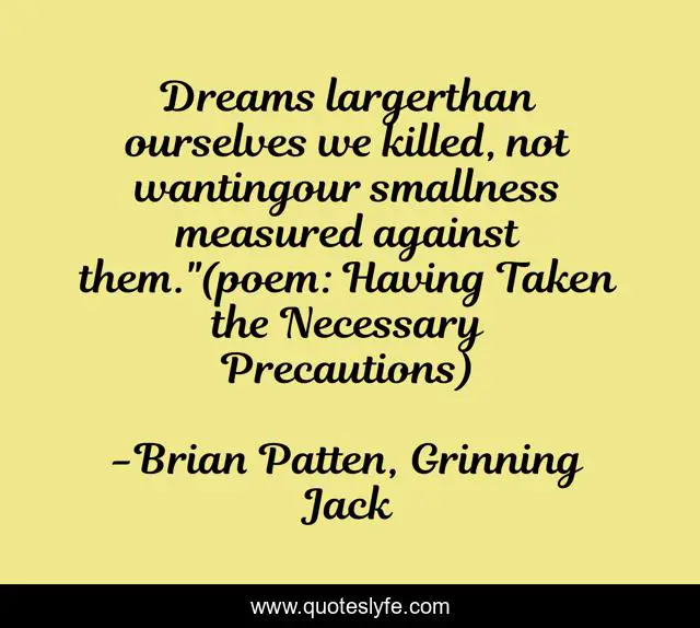 This page presents the quote "Dreams largerthan ourselves we killed, not wantingour smallness measured against them."(poem: Having Taken the Necessary Precautions)". Author of this quote is Brian Patten, Grinning Jack. This quote is about life, dreams,.