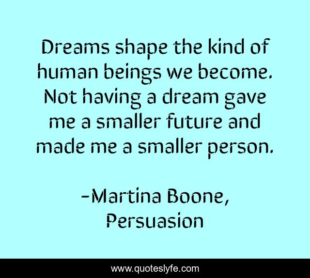 "Martina Boone, Persuasion Quotes." Quoteslyfe.com, 2025. Sat. 06 Dec. 2025. <https://www.quoteslyfe.com/quote/Dreams-shape-the-kind-of-human-beings-54138>.