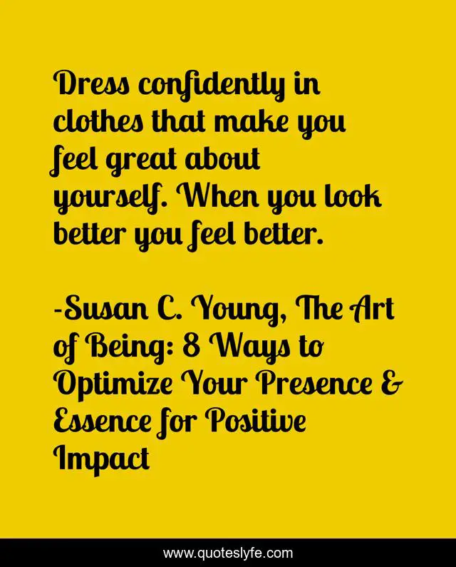 "Susan C. Young, The Art of Being: 8 Ways to Optimize Your Presence & Essence for Positive Impact Quotes." Quoteslyfe.com, 2025. Fri. 05 Dec. 2025. <https://www.quoteslyfe.com/quote/Dress-confidently-in-clothes-that-make-you-199362>.